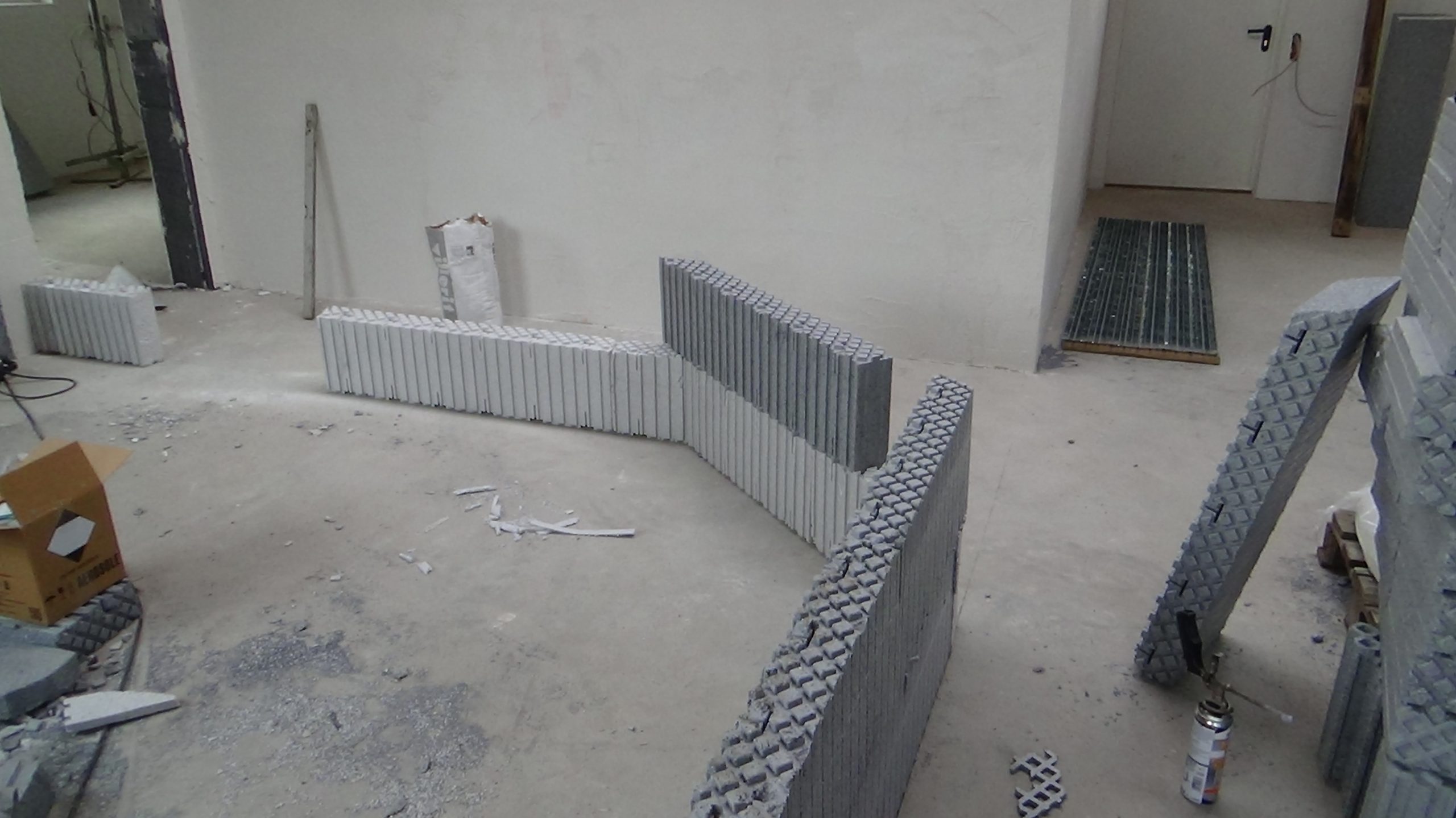 Beim Aufbau der MAGU IN wird die erste Platte mit PU Schaum auf den Boden geklebt. Die folgenden Reihen werden im Versatz aufgesteckt und mit PU Schaum verklebt. Durch den patentierten Steckraster rasten die Platten kraftschlüssig ineinander. Nach dem kompletten Aufstecken der Wand wird zunächst der mitgelieferte MAGU Faserspachtel großflächig auf die MAGU Rasterplatten auftragen und das mitgelieferte MAGU Armierungsgewebe eingearbeitet.
