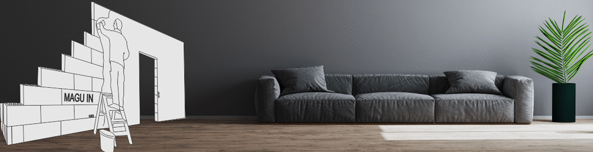 Beim Aufbau der MAGU IN wird die erste Platte mit PU Schaum auf den Boden geklebt. Die folgenden Reihen werden im Versatz aufgesteckt und mit PU Schaum verklebt. Durch den patentierten Steckraster rasten die Platten kraftschlüssig ineinander. Nach dem kompletten Aufstecken der Wand wird zunächst der mitgelieferte MAGU Faserspachtel großflächig auf die MAGU Rasterplatten auftragen und das mitgelieferte MAGU Armierungsgewebe eingearbeitet.