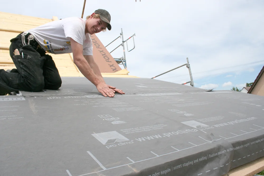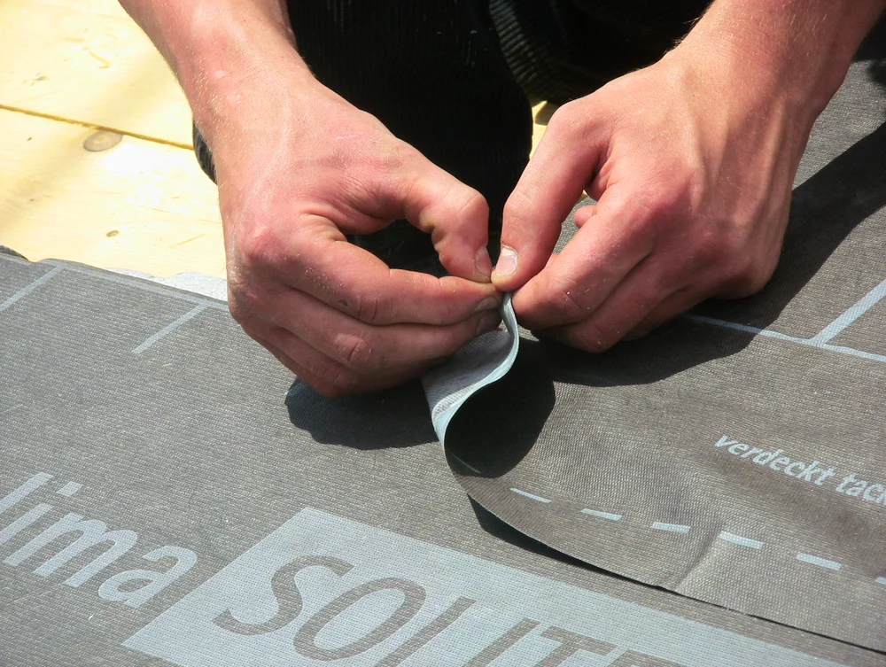 Die Platten gibt es mit aufkaschierter Unterspannbahn. Mit dem Klebeband werden hier die Stöße sorgsam verklebt.